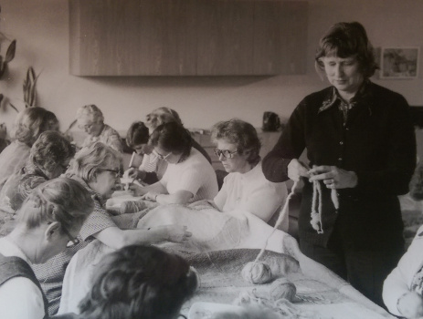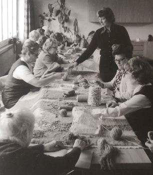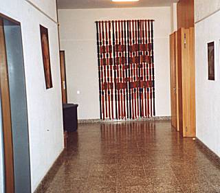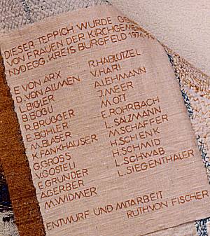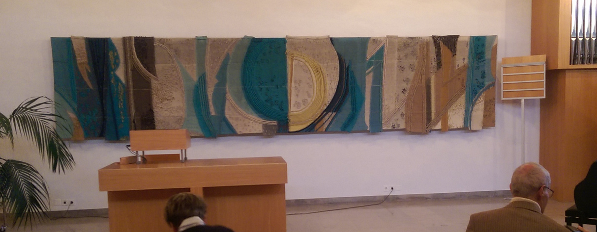 Der Wandbehang mit Kreis wurde für den Hauptraum gefertigt. Eine weitere Arbeit mit Strängen fertigten die Frauen für einen Nebenraum.