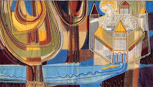 Ich habe mich dann erkundigt, wie dieser Wandteppich entstanden sei, und habe erfahren: die Künstlerin hat das Bild nicht frei erfunden, sondern hat sich durch ein grosartiges "Bild" der Bibel anregen lassen. Im letzten Buch der Bibel, in der "Offenbarung des Johannes", steht am Ende die Vision einer neuen Welt. Das ganze Buch spricht in vielen alten Bildern von Katastrophen und dann eben davon, dass Gott einen neuen Himmel und eine neue Erde schaffe