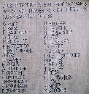 | In den zahllosen Stunden gemeinsamen Arbeitens entstand nicht nur ein prachtvolles Kunstwerk, es wurde auch lebendige Gemeinschaft gelebt. Frau Ruth von Fischer aus Zürich, welche die Vorlage kreierte und unter deren Anleitung das Werk entstand, gab einen kurzen Abriss über seinen Werdegang: von den ersten Kontakten, 1985, über die Themenwahl und die Kriterien der Farbkomposition, bis hin zur Fertigstellung im vergangenen Monat. Sie bedankte sich bei ihren "Teppichfrauen" nicht nur für den unermüdlichen Einsatz, sondern auch für die liebevolle persönliche Betreuung, die sie jeweils auf ihrem Arbeitstag in Nussbaumen erfahren durfte. | Kirchenratspräsident Kurt Weiss hob in seinen Dankesworten die menschlichen Werte hervor, die solch gemeinsames Tun und Wirken schafft, vor allem die hier an der Basis so trefflich gelebte Oekumene. "Die Engel sind im Kommen", das war das eindeutige Bekenntnis von Pfarrer Christoph Hediger auf die strittige Frage, ob es in der reformierten Kirche Engel gibt; womit beileibe nicht allein die Engelsgestalten auf dem Wandteppich gemeint sind, sondern die "Engelscharen" aus dem Dorf, die so segensreich gewirkt haben in diesem vergangenen Jahr. Er bezeichnete die bildliche Darstellung des ersten Schöpfungstages "Es werde Licht" als typisch frauliches Schöpfungsbekenntnis, weil aus einer persönlichen Freiheit heraus eine vielschichtige Botschaft entstanden sei.