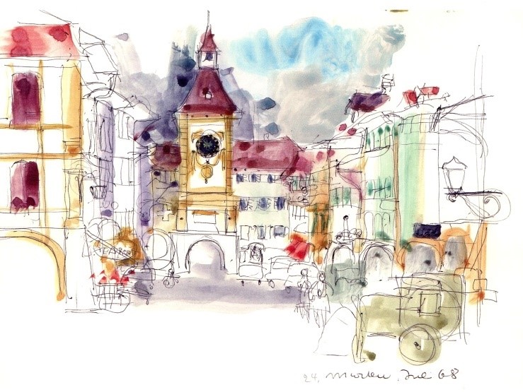 Diese vier Karten zeigen Skizzen von Murten (1968) und vom Hasliberg (1966), sowie vom Murtensee (1969) und eine Winterskizze von Speicher/AR (1968).
