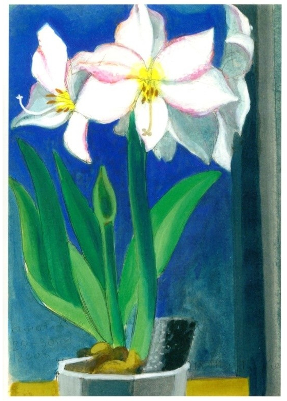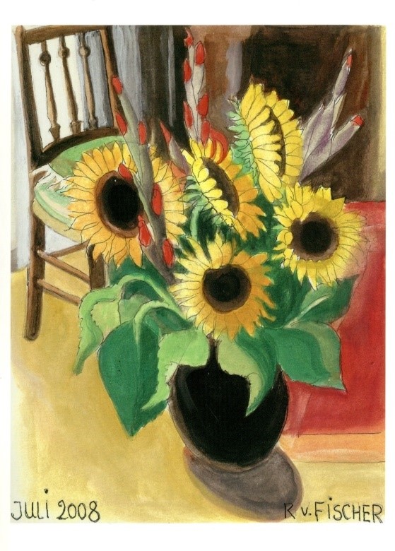 Aus dem reichen Schatz Ruth von Fischers Blumenbilder wurden vier Aquarelle ausgewählt, die alle in der letzten Lebensphase entstanden sind, von starken Farben geprägt sind und von schöner Einfachheit zeugen: so die Amaryllis (2003), die Sonnenblumen (2008), die Hagrosen (2006) und der Tulpenstrauss (2008).