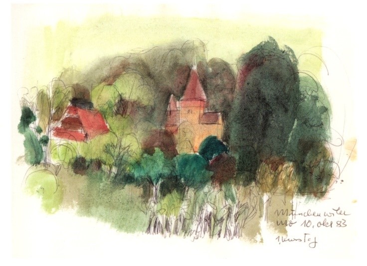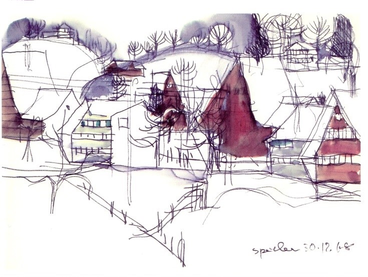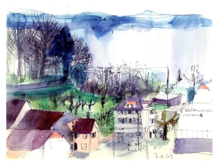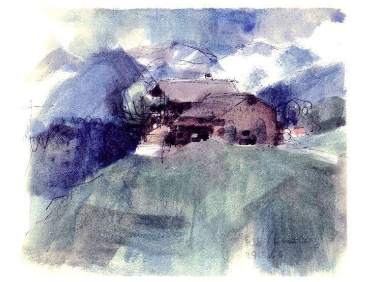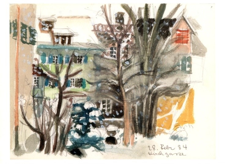 Diese Serie zeigen Skizzen von einem Sonnenuntergang (1983), dem Corvatsch (1978), dem Schloss Münchenwiler/BE (1983) und einem Wintergarten an der Kirchgasse in Zürich (1984).